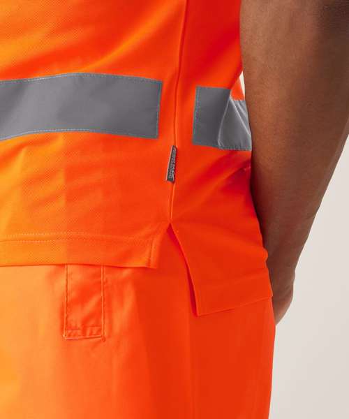 100% polyester, wicking, soft-touch micro mesh – 150gsm. Certified to EN ISO 20471:2013 A1:2016 Class 2. Orange colourway also conforms to RIS-3279-TOM. Gap in reflective tape at side seams improves comfort and stretch. Fabric provides UPF 40+ protection. Side vent detail. Made with recycled content. Two-button placket. Ribbed collar.