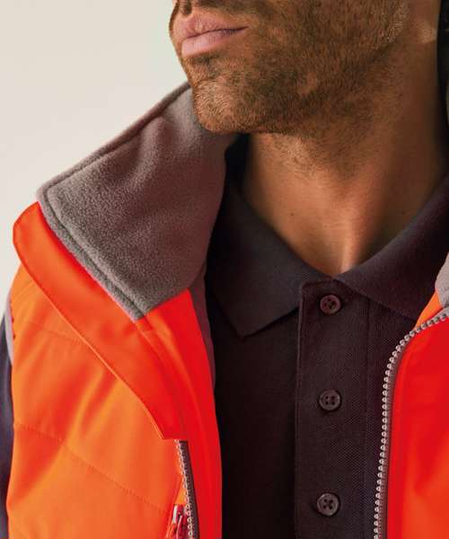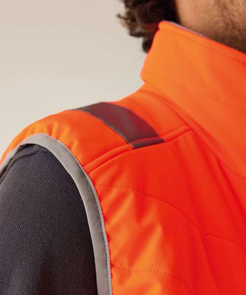 Lightweight four-way stretch outer fabric with durable water-repellent finish. Warmloft insulation, 160gsm. Certified to EN ISO 20471:2013+A1:1026 Class 1. One zipped chest pocket and two lower zipped pockets. Internal pocket. Fleece-lined collar. Stretch binding to armholes and hem. Concealed inner zip for embroidery access. Darker contrast panels, ideal for dirty environments.