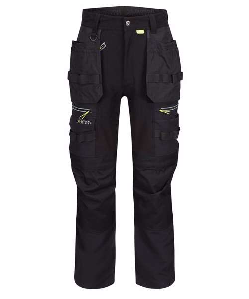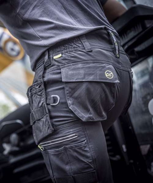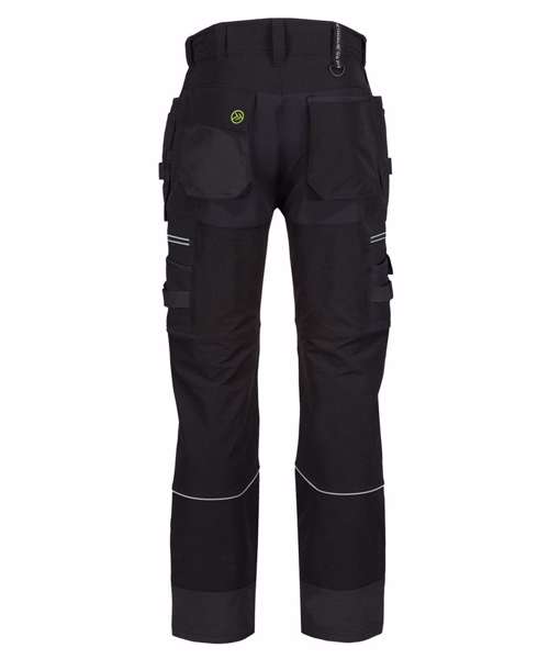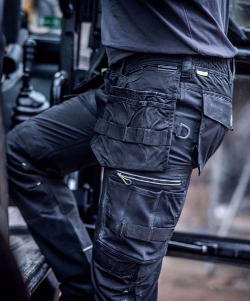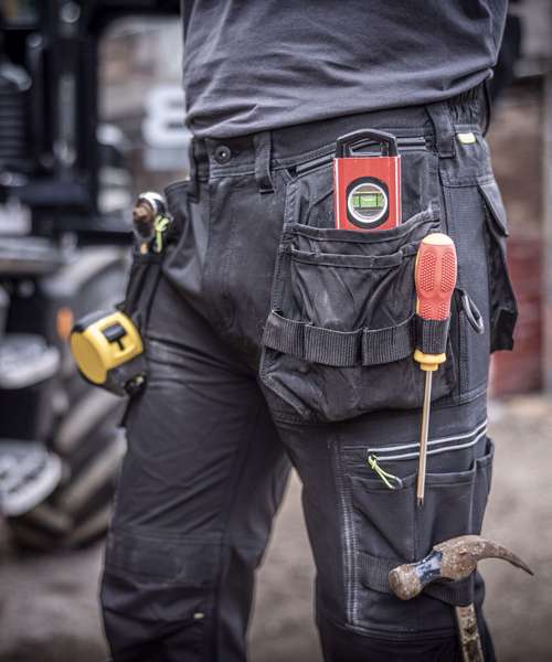 Woven stretch softshell fabric. Ripstop stretch fabric to outer thigh, lower leg, and seat panels. Durable water-repellent finish. Wind-resistant. Cordura® top-loading knee pad pockets. Reinforced seams with triple stitching. Reinforced crotch seam. Easily accessible foldaway 'Holster' pockets with multiple compartments. Multi-function tool and mobile phone pockets on legs, two front pockets, two rear pockets. Shaped high back waistband for comfort. Inner anti-slip waistband print. Reflective piping to the rear of the legs. Slim fit design. Belt loops. D-ring attachment. Reinforced hem overlays. Made using recycled materials.