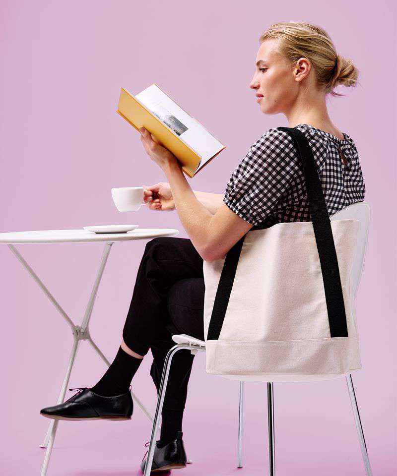 100% Certified recycled cotton, 340gsm. Contrast web handles start from the base gusset detail. Straps: 55cm x 4 cm.