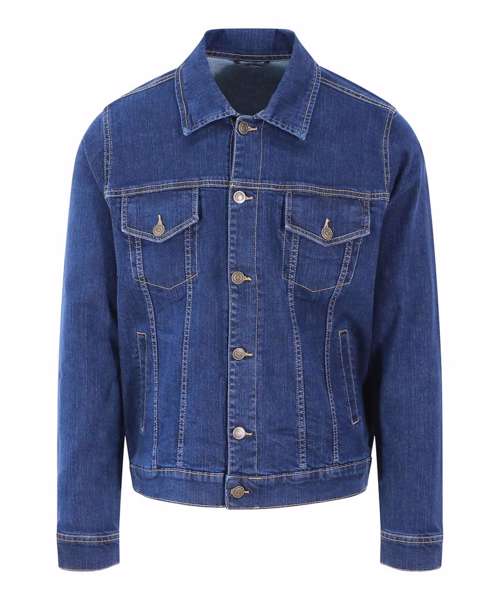 Cotton/elastane blended denim jacket with classic denim styling. 4 pocket design, shank button placket, button cuffs and adjustable back. Fashion fit. Stretch denim. 4 pocket styling. Classic light and dark blue washes. Contrast stitching. Classic denim jacket panelling. Button cuff detail. Inside back neck hanger loop.