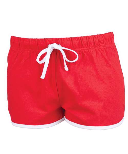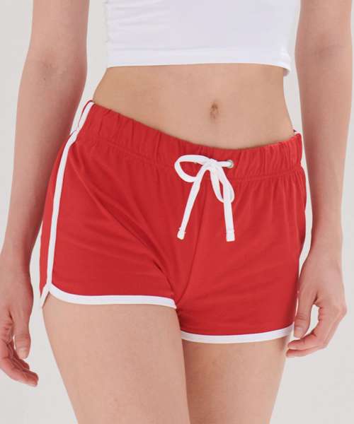 Take a sporty route to fashion with the popular retro shorts. Great style and freedom to move combined in these retro looking shorts, with contrast binding and cute curved side hems. Modern, athletic and cool. Tear-out label, for easy rebranding.