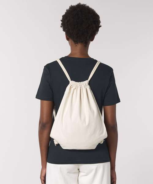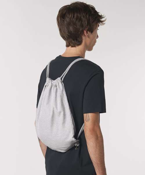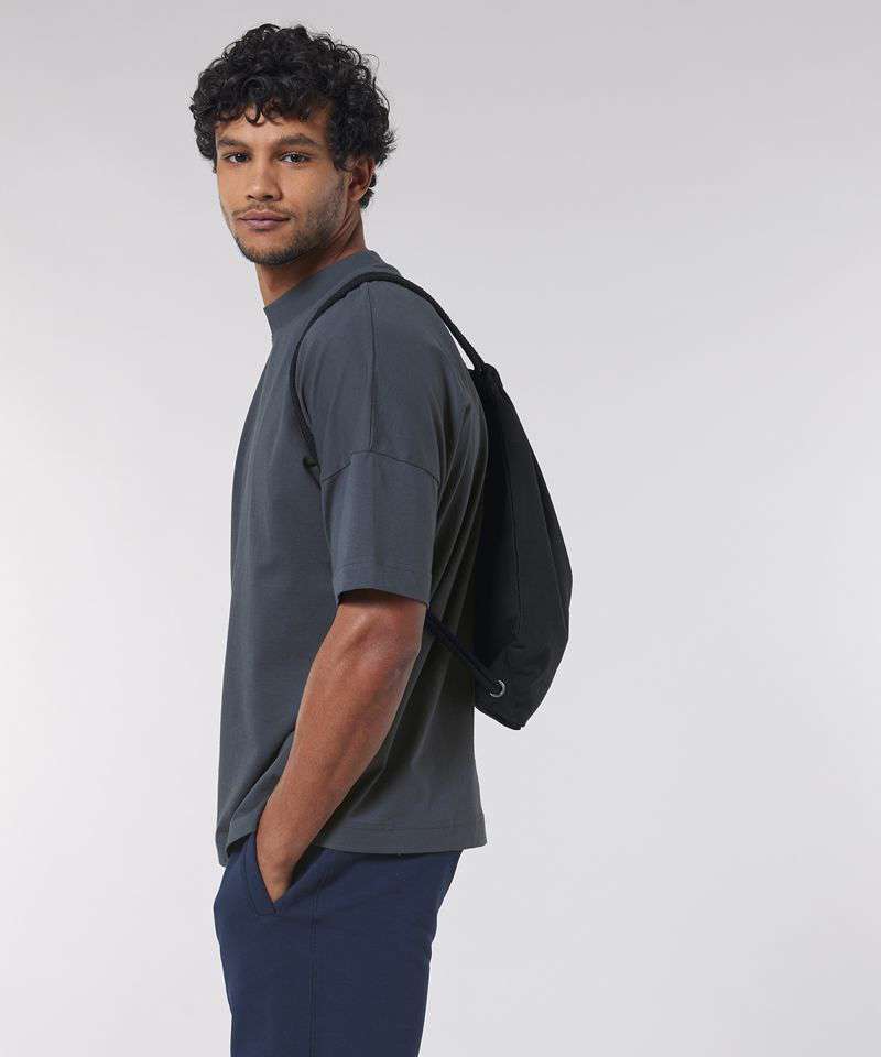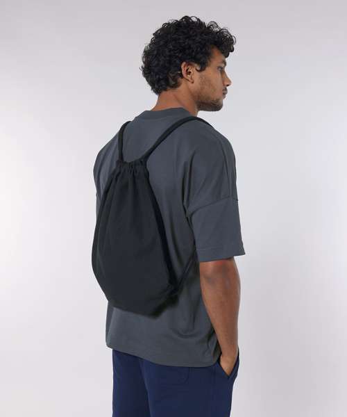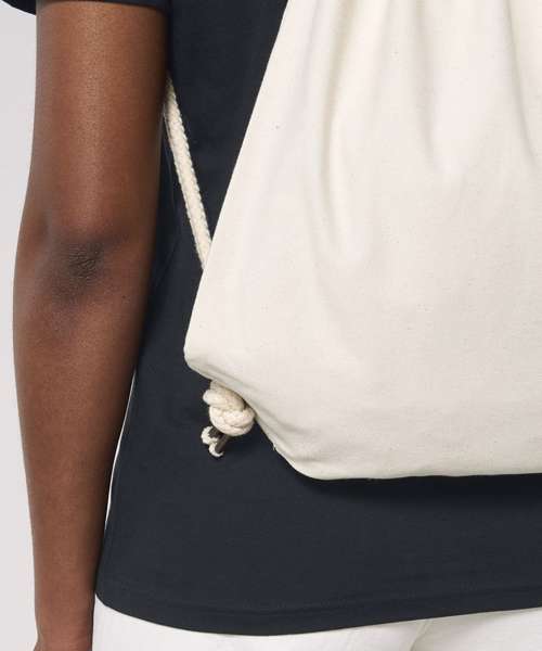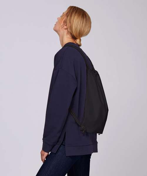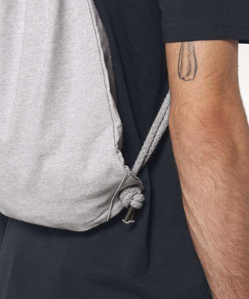The woven gym bag is cut in premium 300gsm 80% reclaimed cotton, 20% recycled polyester and features clean and reinforced finishes.