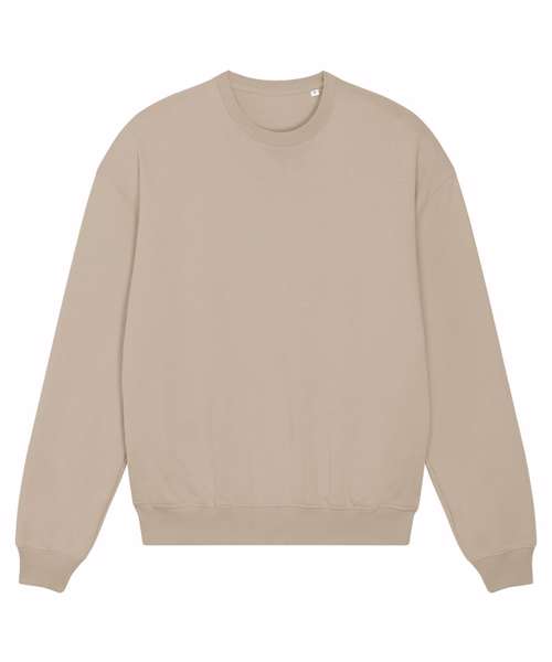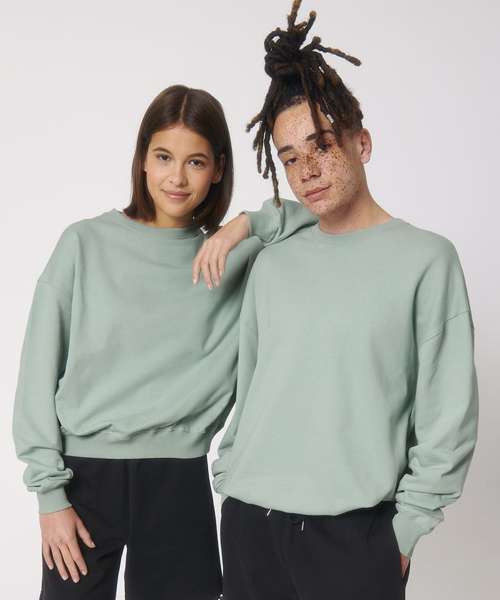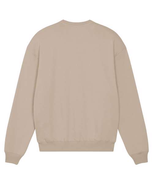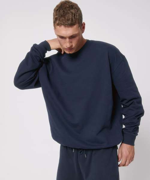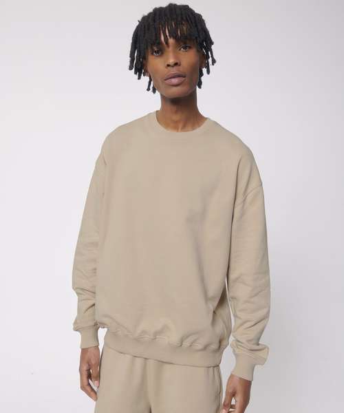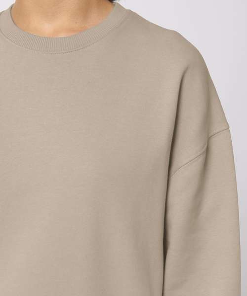 Unisex oversized boxy dry hand-feel crew neck sweatshirt with set-in sleeve, featuring 2x1 rib at neck collar, sleeve hem and bottom hem.