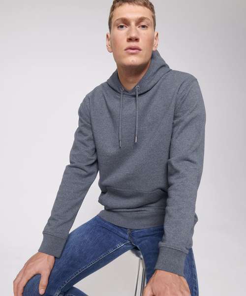 Unisex recycled hoodie sweatshirt. Made from in-house organic cutting waste. Set-in sleeve. Double-layered hood in self-fabric. Round drawcords in matching body colour with metal tipping. Metal eyelets. Inside herringbone back neck tape. Self-fabric half-moon at back neck. Single needle topstitch at neckline and along hood opening. 1x1 rib at sleeve hem and bottom hem. Armhole, sleeve hem and bottom hem with twin needle topstitch. Kangaroo pocket at front. The recycled fibres make the fabric surface less smooth.