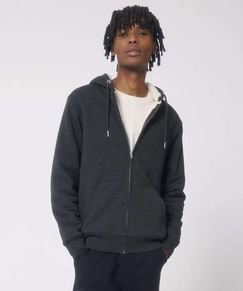 The medium fit unisex sherpa lined zip-through hoodie sweatshirt features a lined hood in recycled sherpa, and has round drawcords in matching body colour with metal tipping. Inside invisible zip at bottom hem for easy decoration.