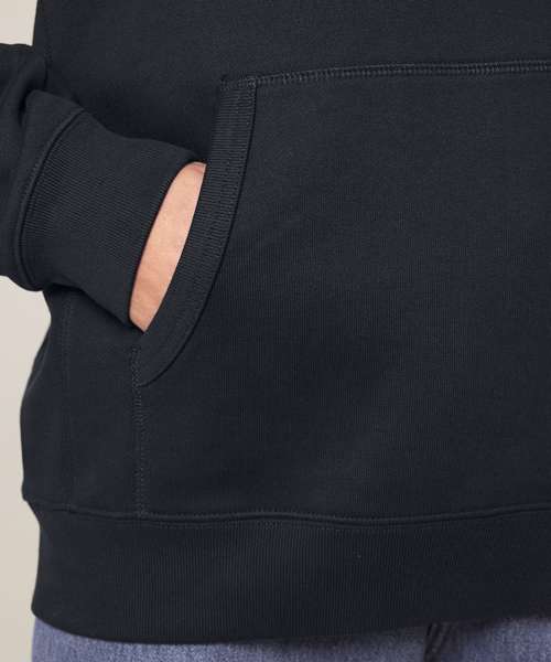 Raglan sleeves. Double-layered hood in self-fabric. Kangaroo pocket at front. 1x1 ribs at sleeve cuffs and bottom hem. 1x1 rib side panels. 1x1 rib bindings at pocket openings. Double-needle topstitches at the collar, sleeve cuffs and bottom hem. Three-needle flatlock stitches at raglan seam and side panel seams. Inside herringbone back neck tape. Self-fabric half moon at the back neck.
