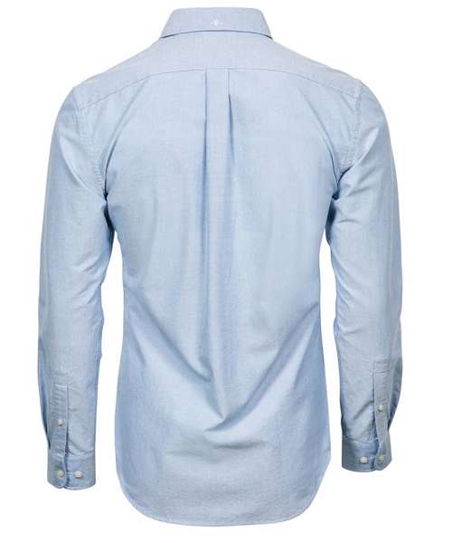 Shaped fit. Button-down collar. Fused collar and cuffs. Back yoke with box pleat. Inside hanger loop. Curved hem. Stretch fabric. Ascolite button wrapping.