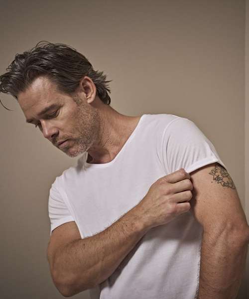 The fashion-fit, single Jersey, Roll-up tee is made from premium quality, long-fibre cotton. It features roll-up sleeves with bar tacks and a large neck opening with a minimalistic neck rib.