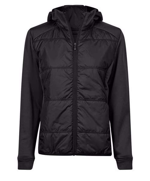 The Women’s hybrid-stretch hooded jacket is made from 300T polyester fabric combined with stretch fleece panels and sleeves. It’s insulated with premium DuPont™ padding on the body, with cuffs and elastic banding at the bottom hem for a modern look. It features quality SBS zips, an inner pocket and two large hidden front pockets. The hood makes this jacket extra-comfortable on colder days.