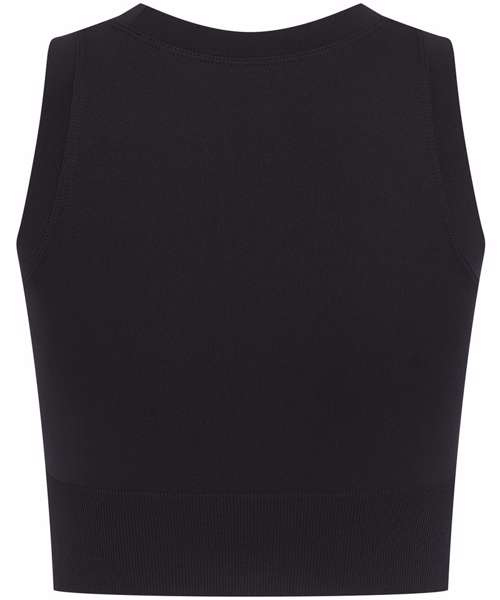 Women’s cropped tank. Seamless fabric. Single-layer front. Self-fabric binding around neck and armhole. Ribbed hem.