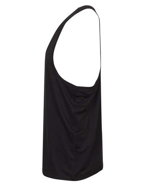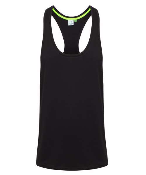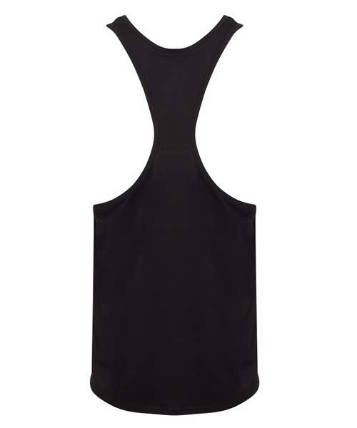 Shaped work out vest, lightweight soft hand feel fabric, self fabric binding, tear-out label.