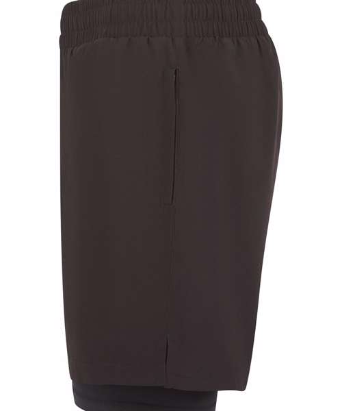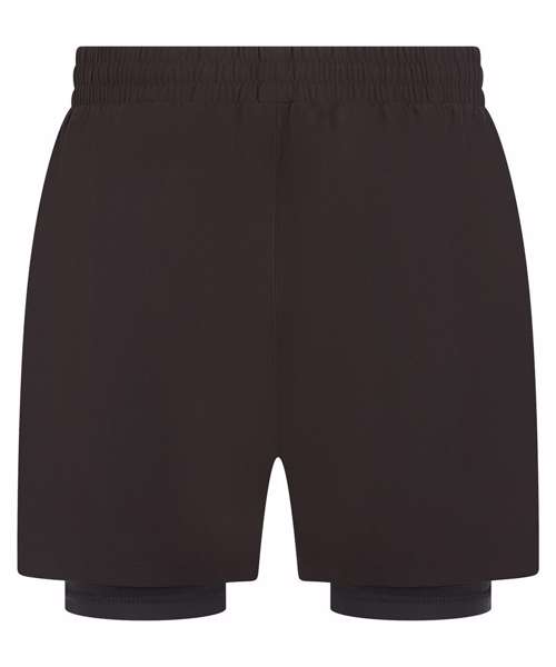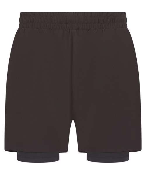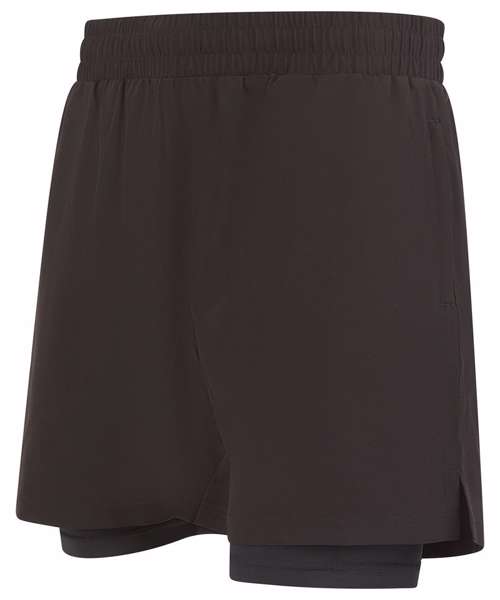 Men’s double-layer sports shorts with four-way stretch. Microfibre top short and polyester interlock under short. Side zipped welt pockets. Self-fabric elasticated waistband with inner drawcord. Side vents. Integrated under short. Phone pocket on under short, right-hand side when worn with media access. WIcking properties on under short. Tear-out label.