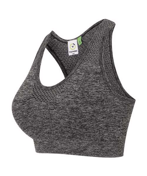 Seamless bra with removable padded cups and racerback. Self- fabric mesh inserts on front straps, V insert on front and on racerback panel. Self-fabric binding around neck, armholes and back. Tombo tear-out label.