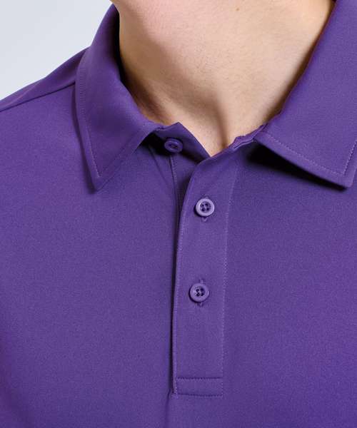 Wicking fabric. Polo shirt. Short sleeve. Mesh panels on sides excluding Melange colouways. 3-button placket. Self-fabric collar. We recommend using block out vinyl and inks.Product contains no branded neck or waist label. Removable Kimble or looped garment tags. Inner seam label holds important product information on one label with a second label containing brand information which can be cut-away. UPF 40+.