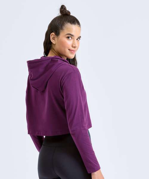 Cropped hooded t-shirt. Long sleeve. Drawcords dyed to match with gunmetal eyelets and drawcord caps. Double layer hood. Soft-feel. We recommend using block out vinyl and inks.Product contains no branded neck or waist label. Removable Kimble or looped garment tags. Inner seam label holds important product information on one label with a second label containing brand information which can be cut-away.