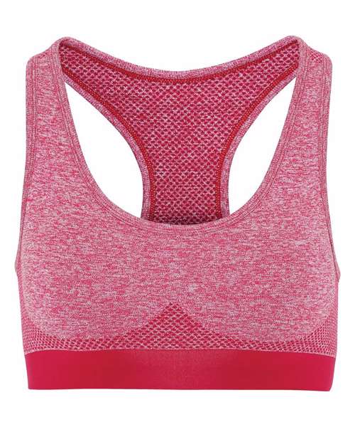 Seamless sports bra. Contrast grown on waistband. Wicking fabric. Body sculpting design detailing. Medium impact. We recommend using block out vinyl and inks.Product contains no branded neck or waist label. Removable Kimble or looped garment tags. Inner seam label holds important product information on one label with a second label containing brand information which can be cut-away.