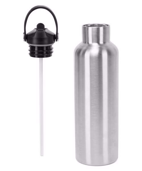 100% stainless steel water bottle. Screw lid. Flip-up straw. Inner removable plastic straw for easy cleaning. Loop for easy carrying. Keeps liquids hot or cold. Wash before use. One size. Height: 26cm. Capacity: 750ml.