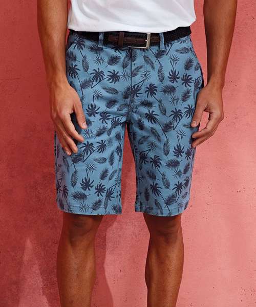 Two swing pockets and two back jet pockets. Zip fly and button fastening to the front. Soft finish fabric. Belt loops. Palm print detailing. Shorts can be worn rolled up.