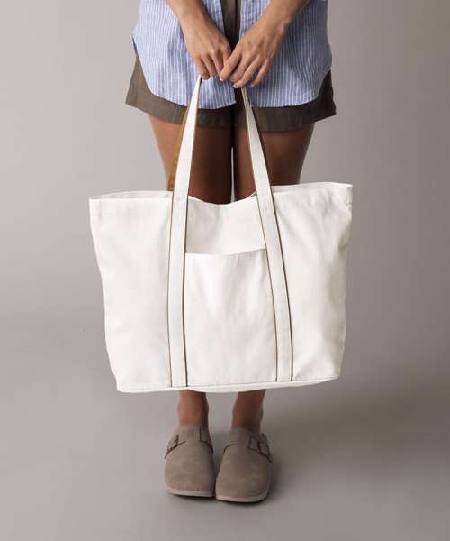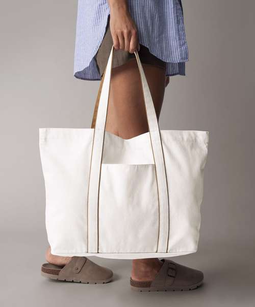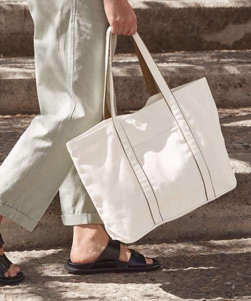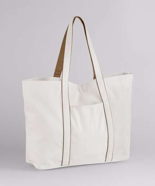 Contains 100% certified recycled cotton. Premium heavyweight fabric. Main compartment with magnetic closure. Hidden external slip pocket. Piped base panel. Handles with contrast detailing. Self-fabric carry handles. Can be carried by hand or over the shoulder. CutAway label for ease of rebranding.
