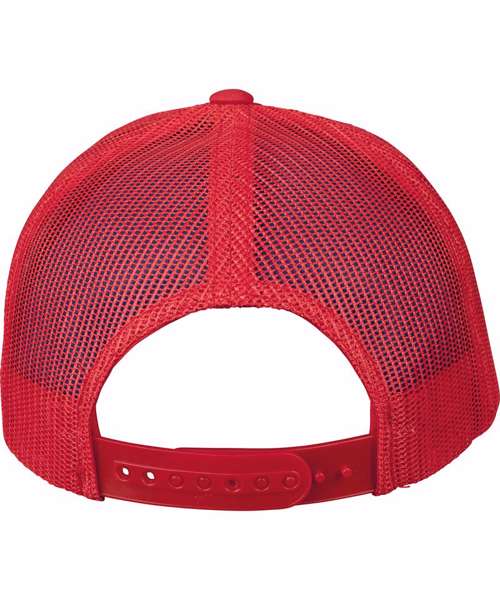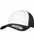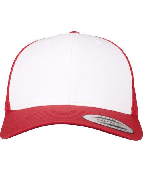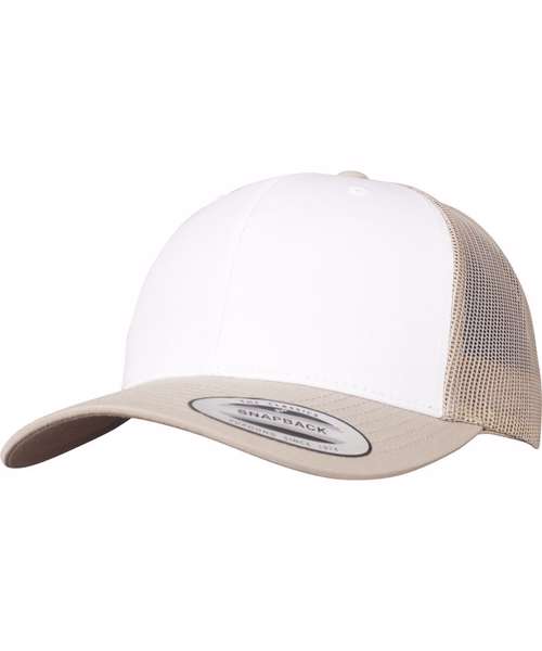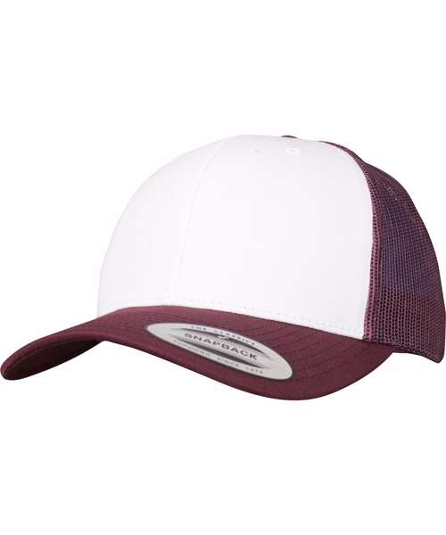 Classic trucker cap. White front. Matching brim. Mesh back in contrasting colour. Lower profile. Structured canvas front. Center seam in snapback style.