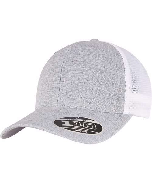 Two-toned trucker cap with adjustable, color-matching snapback closure, made of cotton and polyester, one size fits all, Flexfit 110 technology, 8-fold quilted, pre-bent visor.